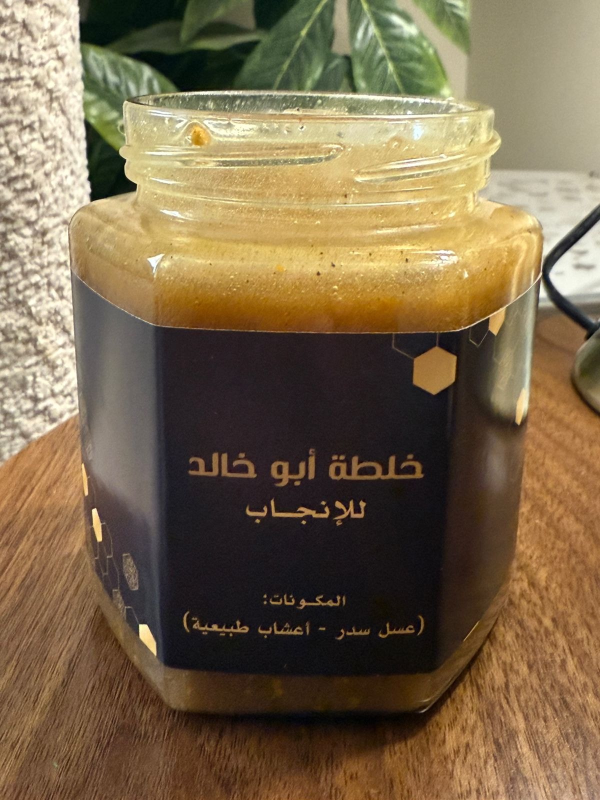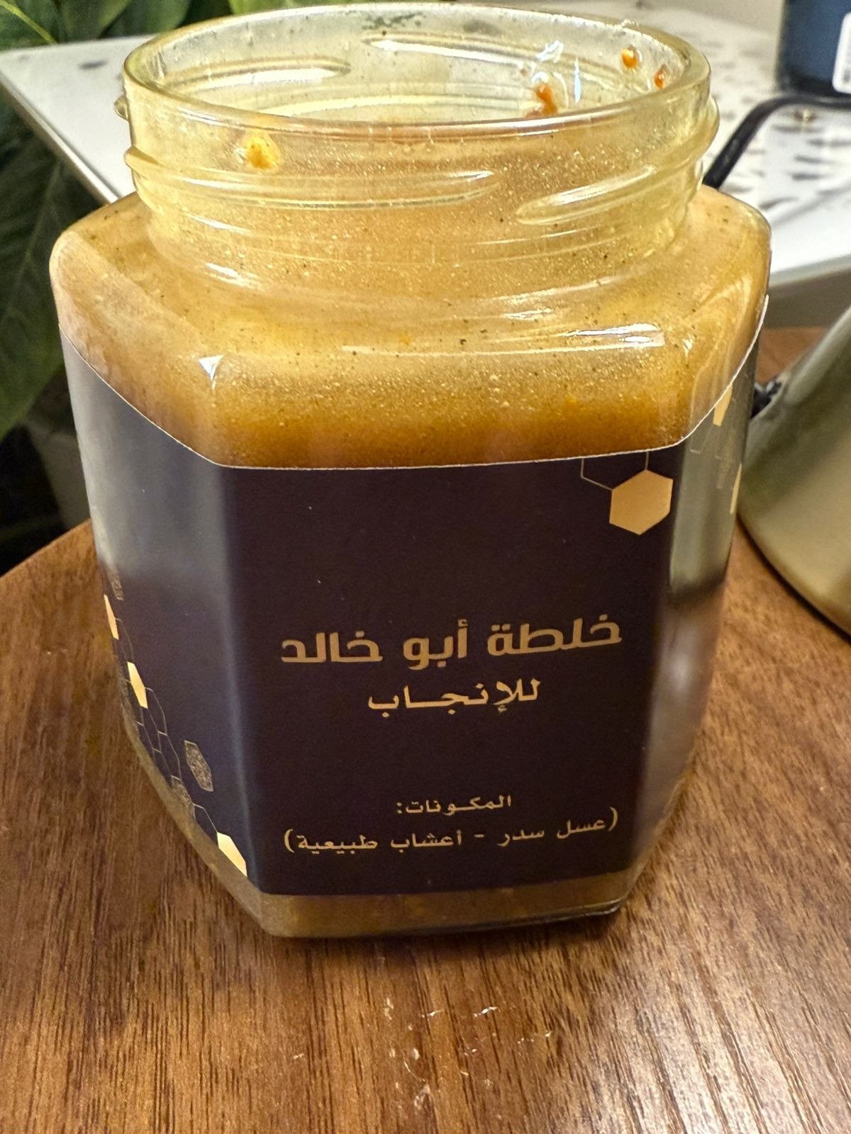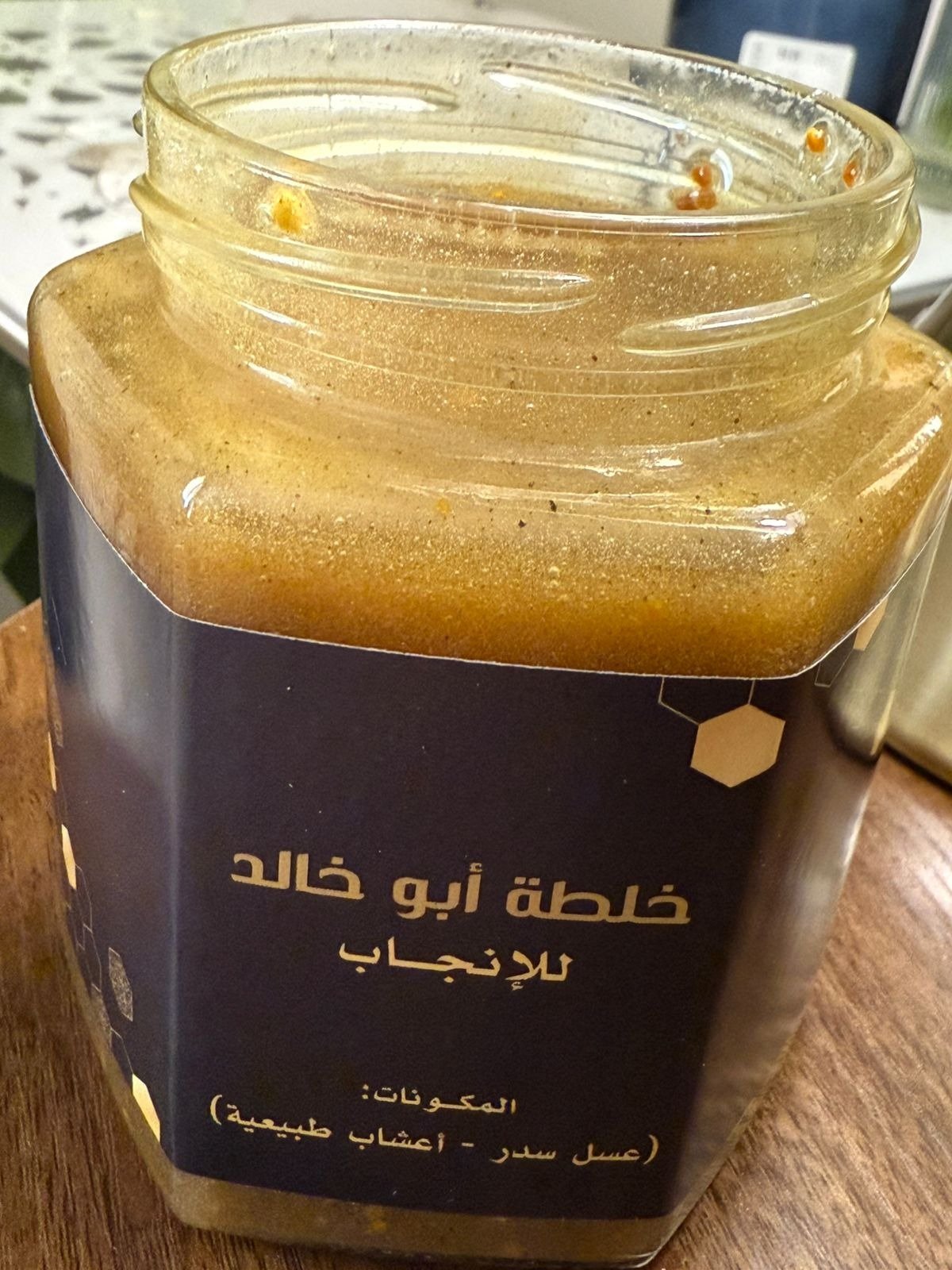 * عسل السدر الطبيعي + العكبر + حبوب اللقاح + غذاء الملكات + طلع النخل. بالاضافة اعشاب
